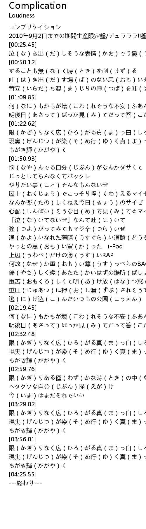 | [04:11.71] | 現実(げんじつ)が染(そ)め行(ゆ)く真(ま)っ暗(くら)な明日(あした)に何(なに)を描(えが)く |