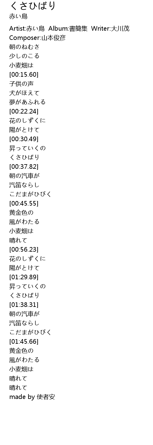 | [00:00.50] | Artist:赤い鳥 Album:書簡集 Writer:大川茂 Composer:山本俊彦 |