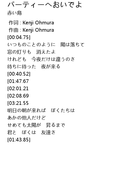 | [03:14.95][02:08.69][01:05.50] | ぼくらの パーティーへ |