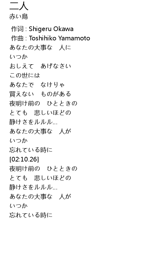 | [00:00.000] | 作词 : Shigeru Okawa |