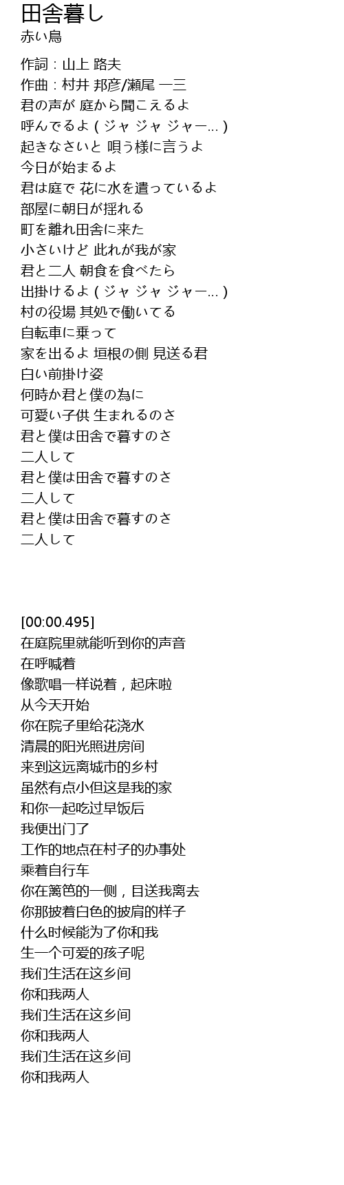 | [02:21.401] | 君と僕は田舎で暮すのさ |