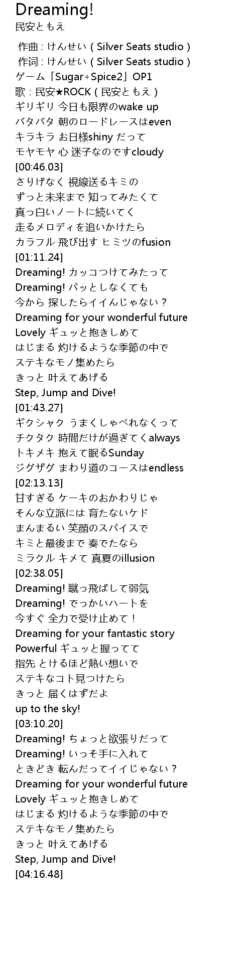 | [03:46.92] | Dreaming! ちょっと欲張りだって |