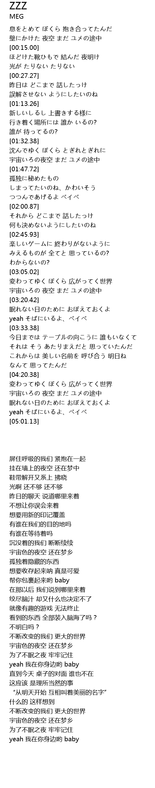 | [03:13.24] | 宇宙いろの 夜空 まだ ユメの途中 |