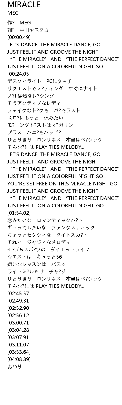| [03:37.88][03:07.91] | “THE MIRACLE” AND “THE PERFECT DANCE” |