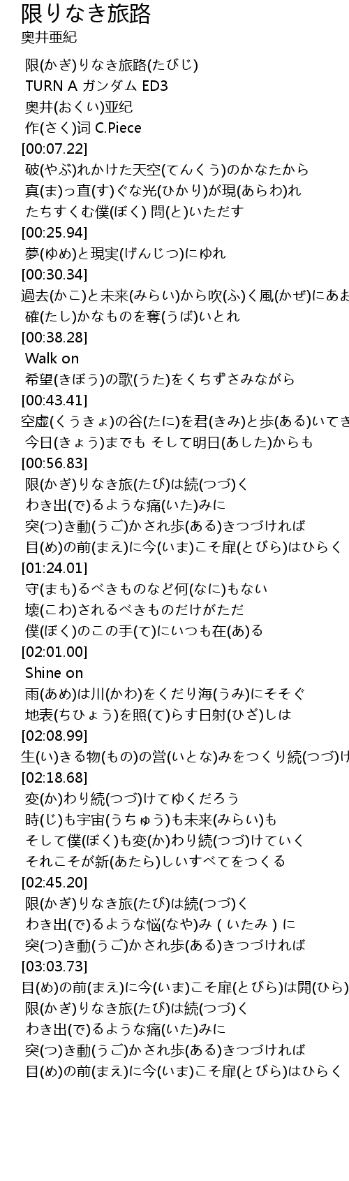 | [00:00.86] | 限(かぎ)りなき旅路(たびじ) |