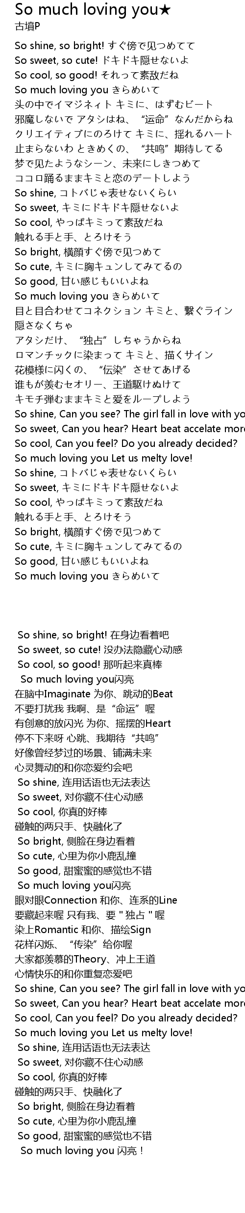 | [00:04.540] | So sweet, so cute! ドキドキ隠せないよ |