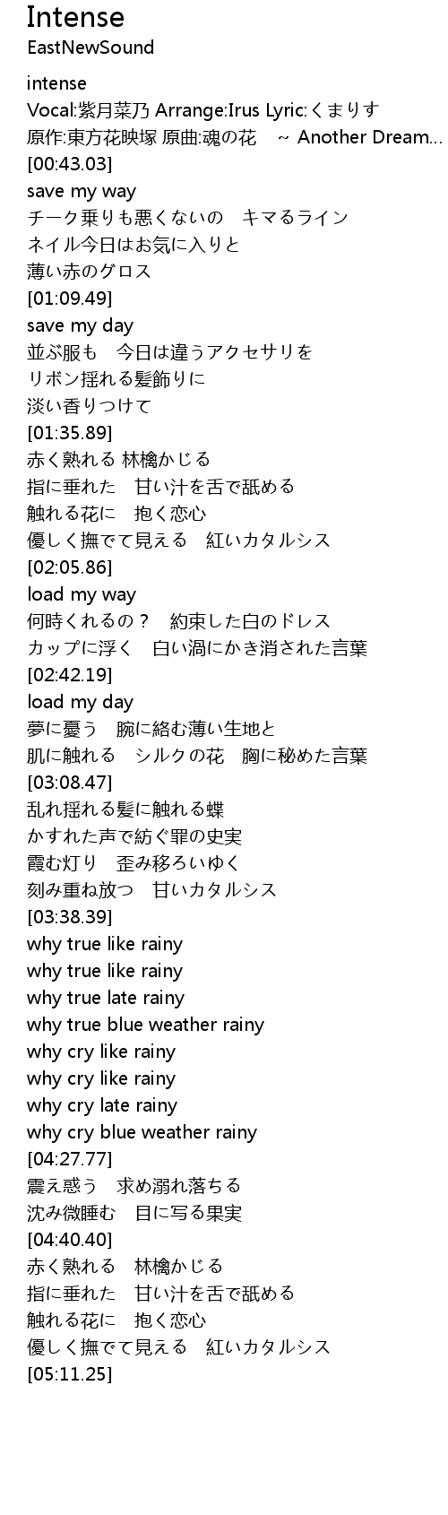 | [00:16.63] | Vocal:紫月菜乃 Arrange:Irus Lyric:くまりす |