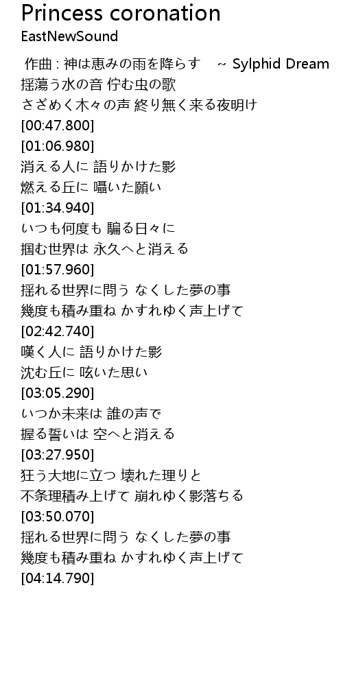| [00:00.00] | 作曲 : 神は恵みの雨を降らす ~ Sylphid Dream |