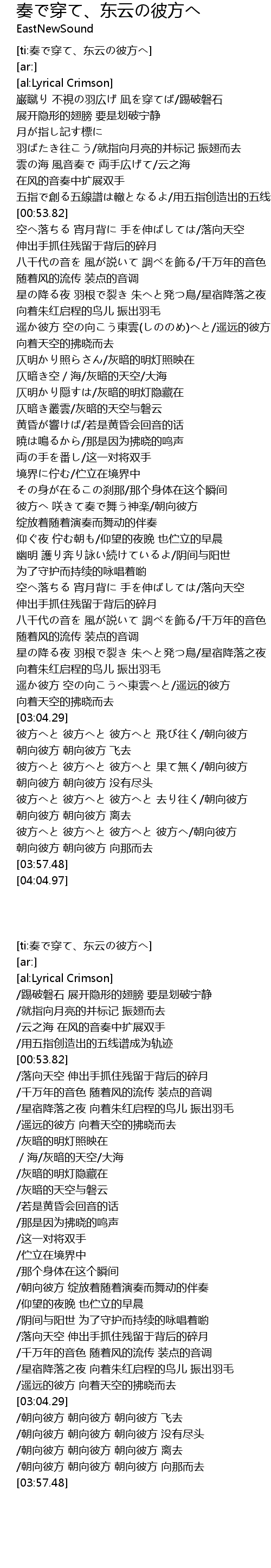 | [03:51.39] | 彼方へと 彼方へと 彼方へと 彼方へ/朝向彼方 朝向彼方 朝向彼方 向那而去 |