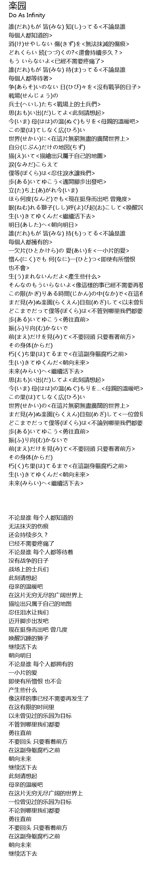 | [03:57.870] | まだ見(み)ぬ楽園(らくえん)目指(めざ)して<一位曾見過的樂園為目標> |