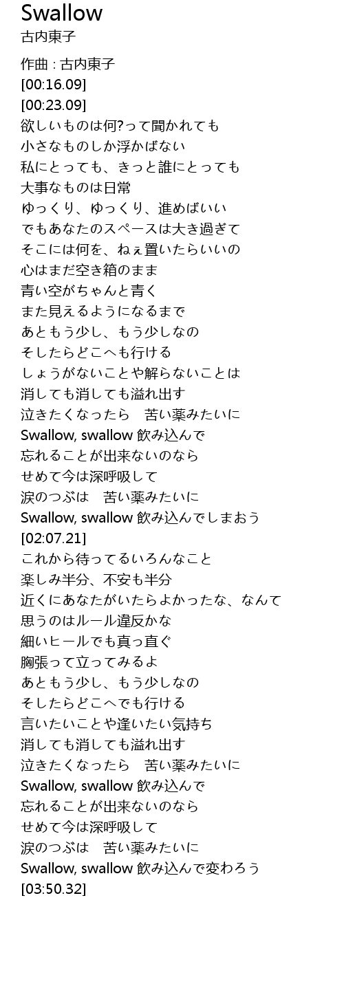 | [02:00.15] | Swallow, swallow 飲み込んでしまおう |