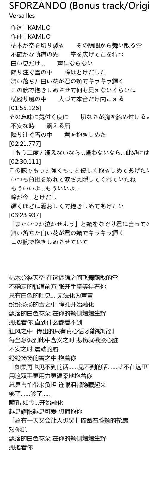 | [02:11.803] | 降り注ぐ雪の中 君を抱きしめた |