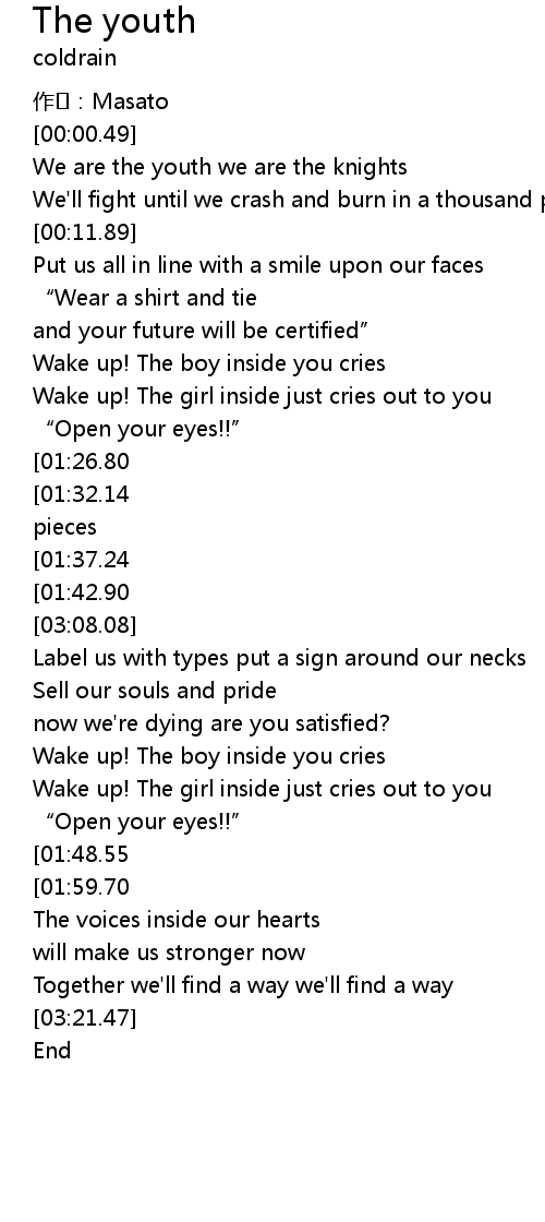 | [02:57.28][01:37.24][00:54.54] | We are the youth we are the light |