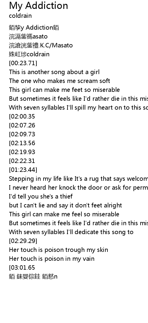 | [03:31.80][02:22.31][01:19.12] | It's my my my my my addiction |
