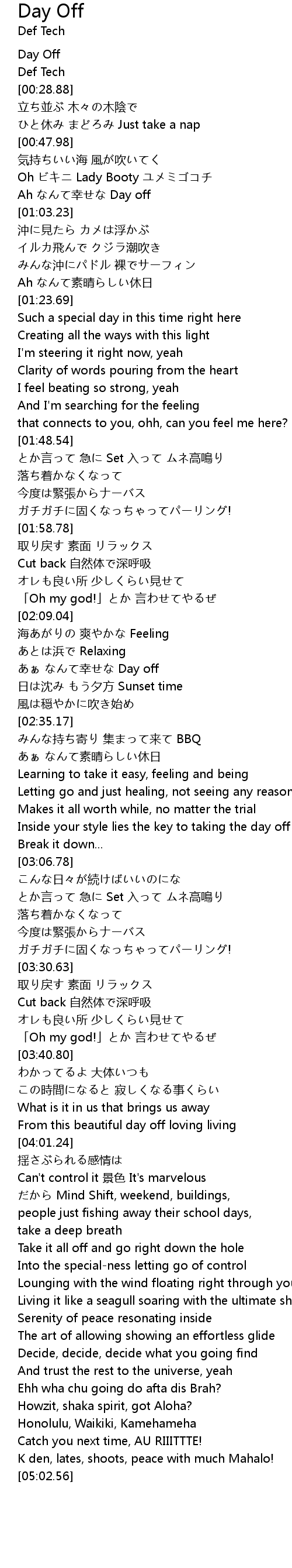 | [02:25.46] | あぁ なんて幸せな Day off |