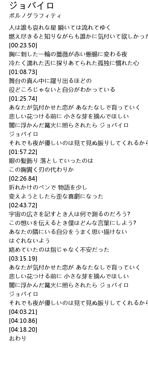 | [03:46.79] | 闇に浮かんだ篝火に照らされたら ジョバイロ ジョバイロ |