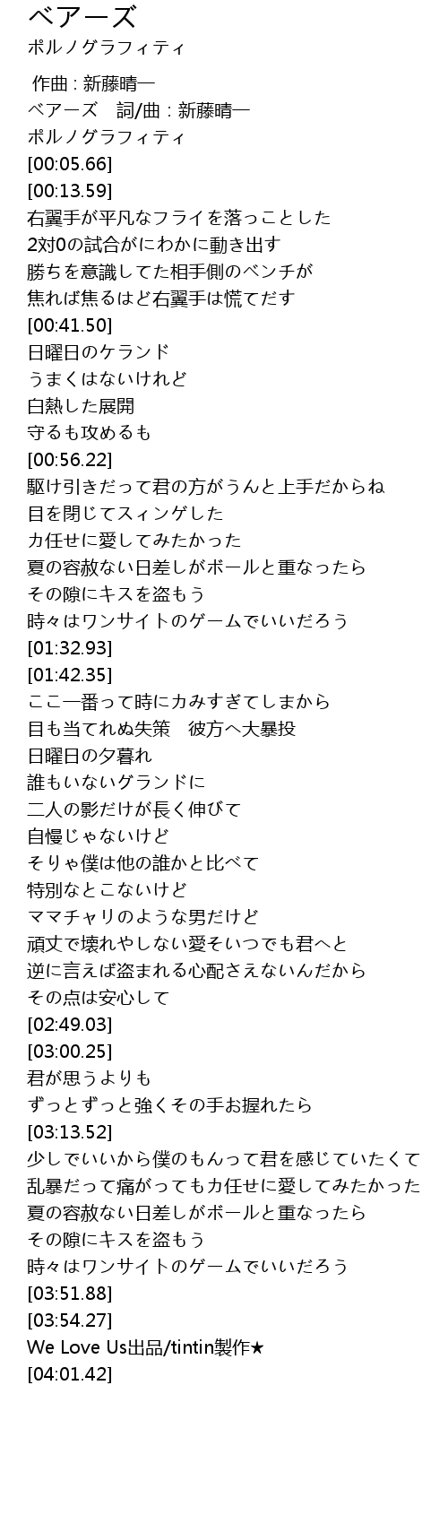 | [00:03.84] | ベアーズ 詞/曲:新藤晴一 |