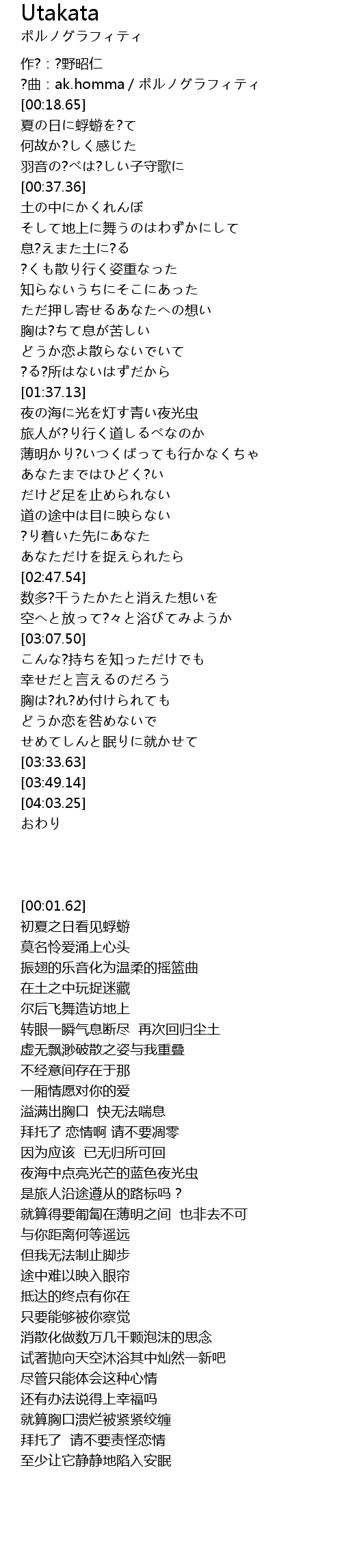 | [00:14.65] | ?曲:ak.homma/ポルノグラフィティ |