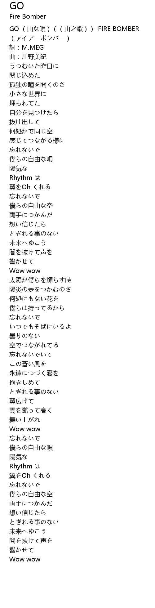 | [00:00.00] | GO (由な唄)((由之歌))-FIRE BOMBER (ァイアーボンバー) |