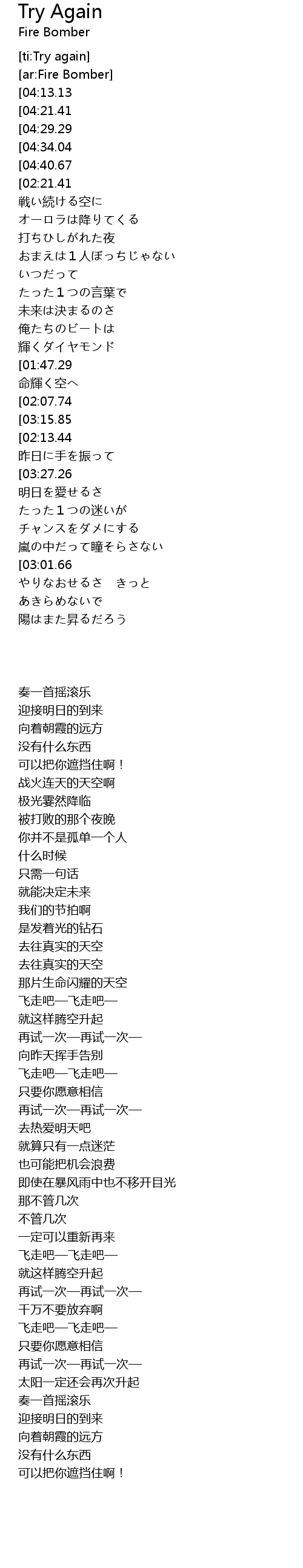 | [02:01.99][02:13.44][03:19.24][03:30.65] | TRY AGAIN-TRY AGAIN |