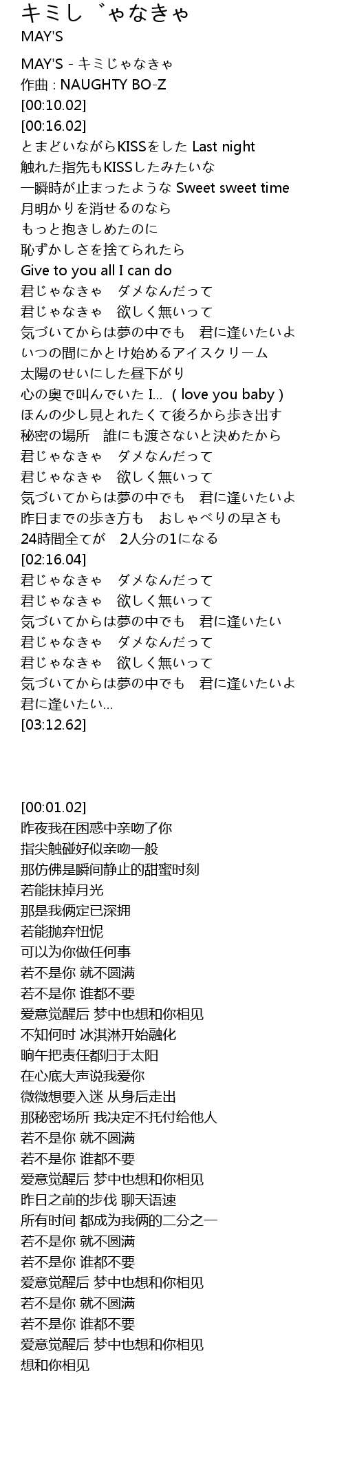 | [00:01.02] | MAY'S - キミじゃなきゃ |