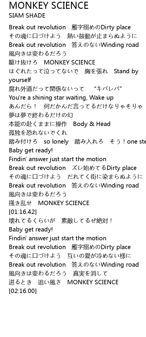 | [00:19.63] | 駆け抜けろ MONKEY SCIENCE |