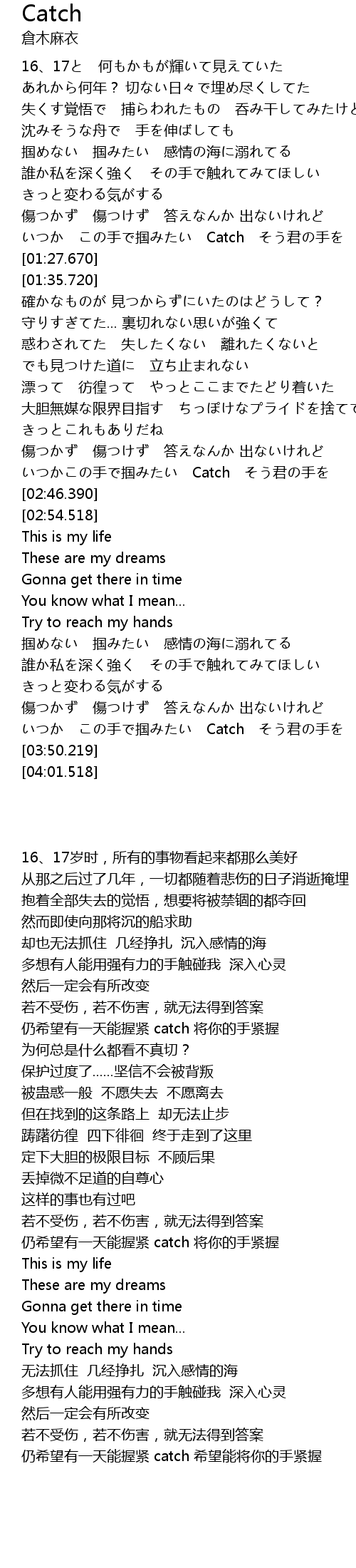 | [02:40.268] | いつかこの手で掴みたい Catch そう君の手を |