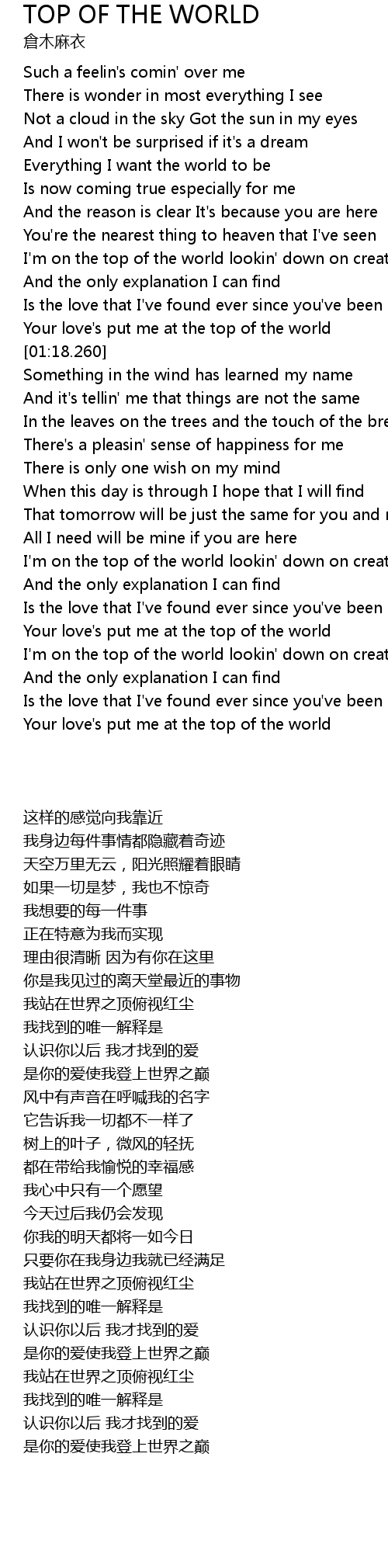 | [00:58.190] | I'm on the top of the world lookin' down on creation |
