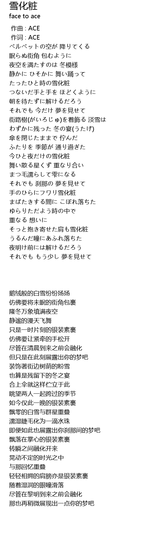 | [03:29.330] | そっと抱き寄せた肩も雪化粧 |