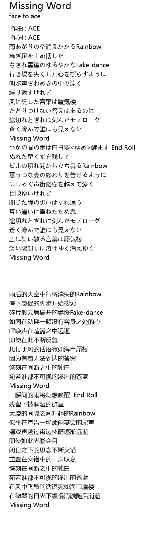 | [00:01.00] | 作词 : ACE |