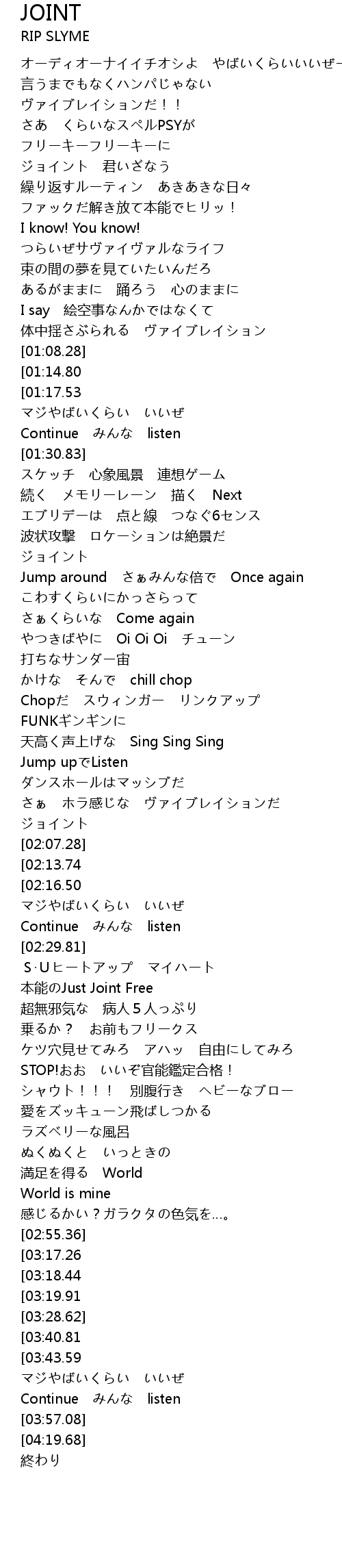 | [03:22.88][03:17.26][03:11.65][03:05.94] | パリーピーポー ジョイント(ハァ?) |