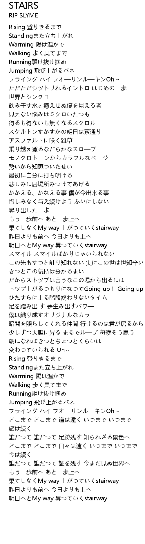 | [01:14.87] | 果てしなくMy way 上がつていくstairway |