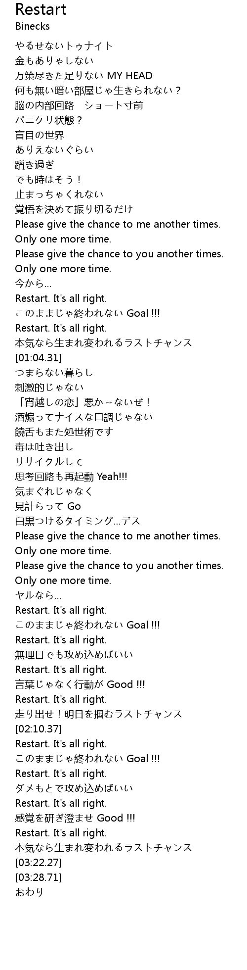 | [01:23.45] | 思考回路も再起動 Yeah!!! |