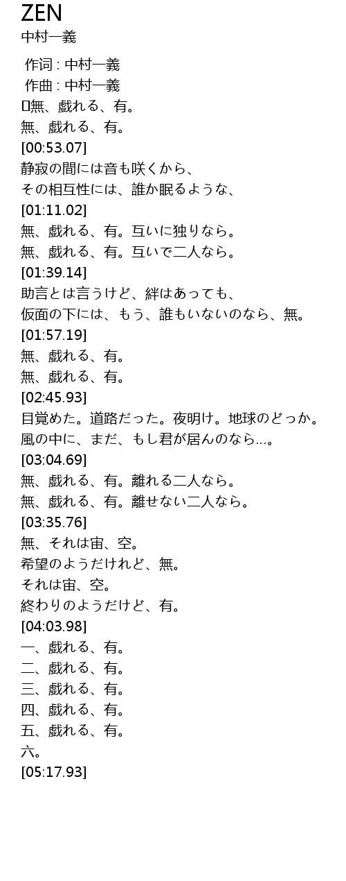 | [01:11.33] | 無、戯れる、有。互いに独りなら。 |