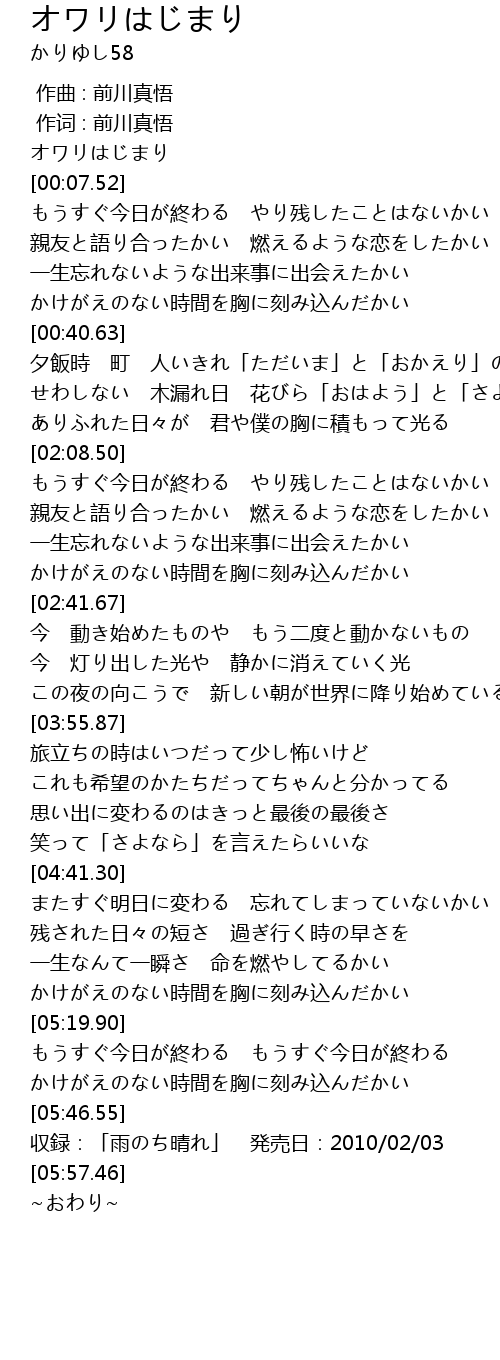 | [05:21.43] | もうすぐ今日が終わる もうすぐ今日が終わる |