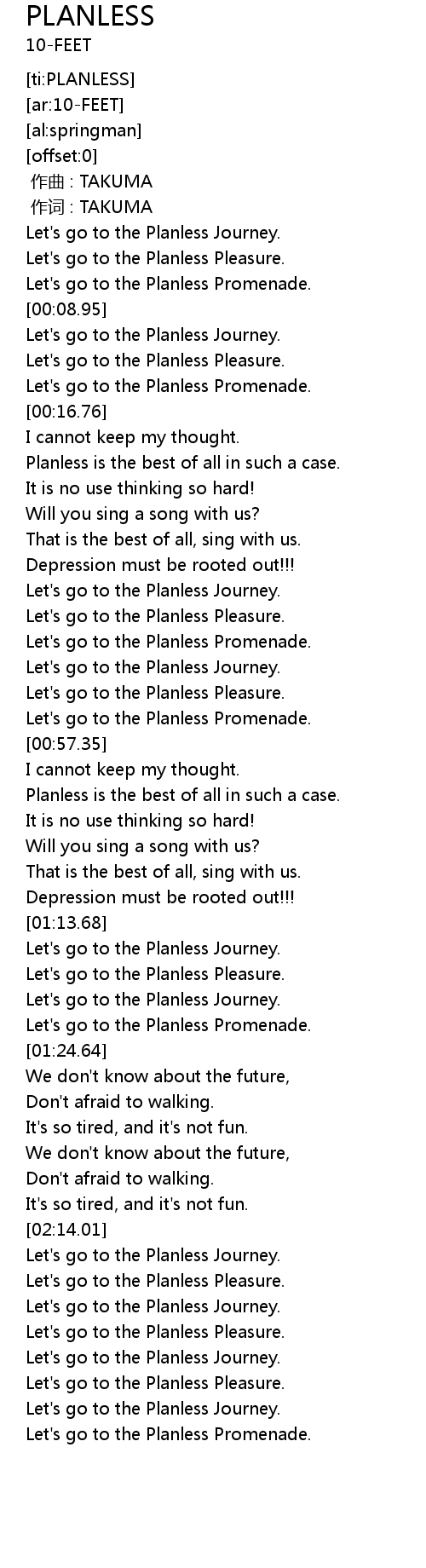 | [02:18.86] | Let's go to the Planless Journey. |