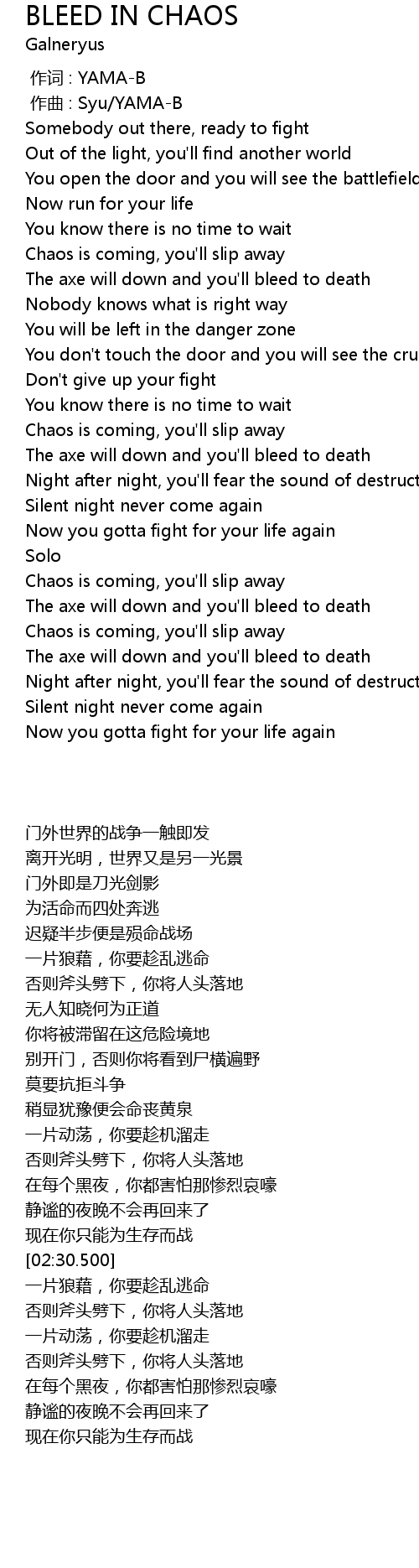| [02:03.900] | Chaos is coming, you' ll slip away |