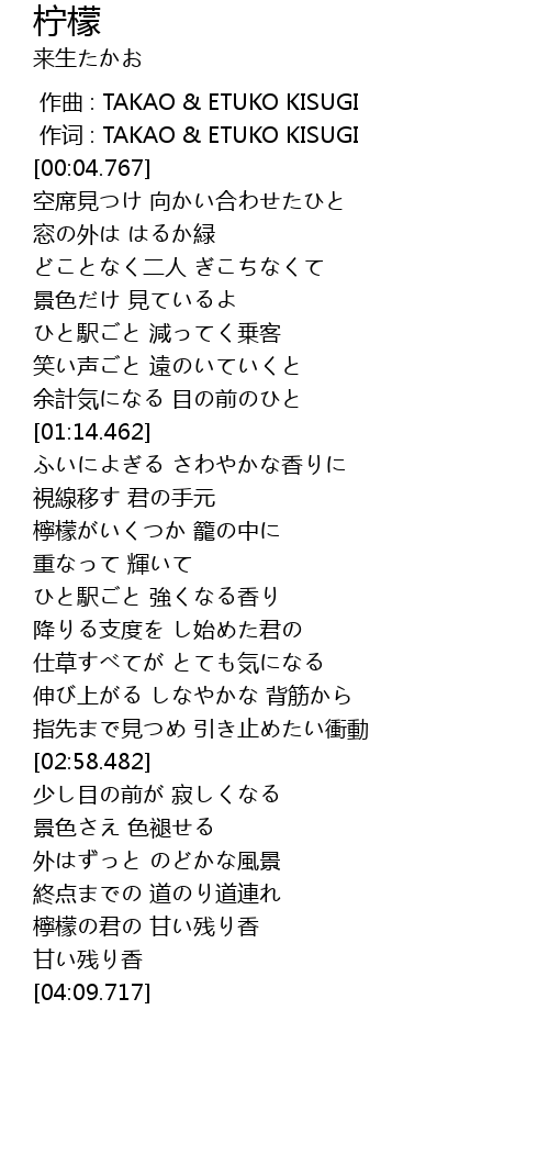 | [03:45.528] | 檸檬の君の 甘い残り香 |