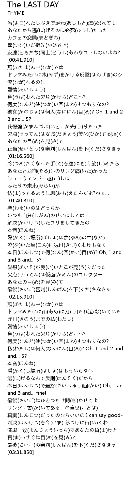 | [03:24.730] | 真(ま)っすぐに目(め)を見(み)て 最後(さいご)の審判(しんぱん)を下(くだ)さなきゃ |