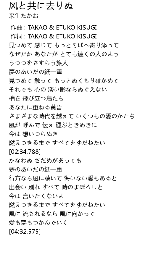 | [00:00.000] | zuo qu : TAKAO ETUKO KISUGI |