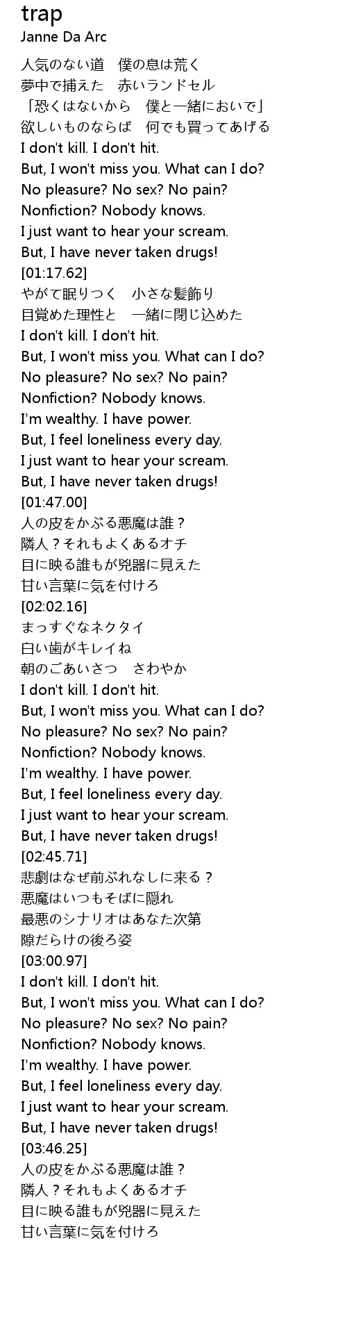 | [01:47.36] | 人の皮をかぶる悪魔は誰? |