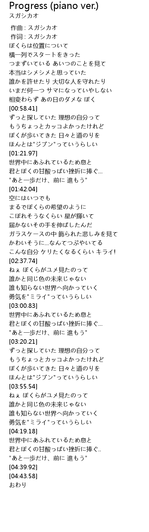 | [04:25.70] | 君とぼくの甘酸っぱい挫折に捧ぐ.. |