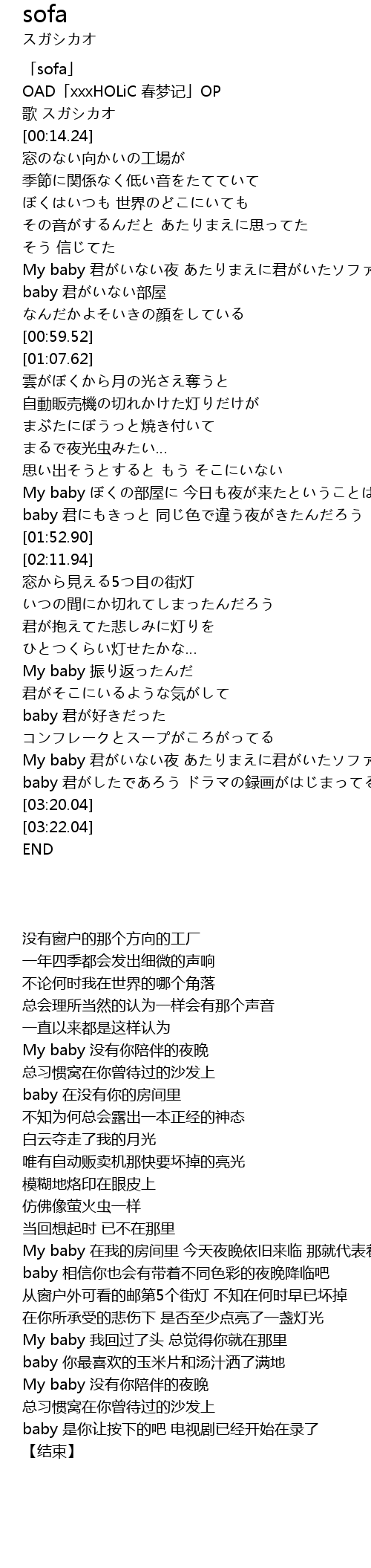 | [00:37.34] | My baby 君がいない夜 あたりまえに君がいたソファ |