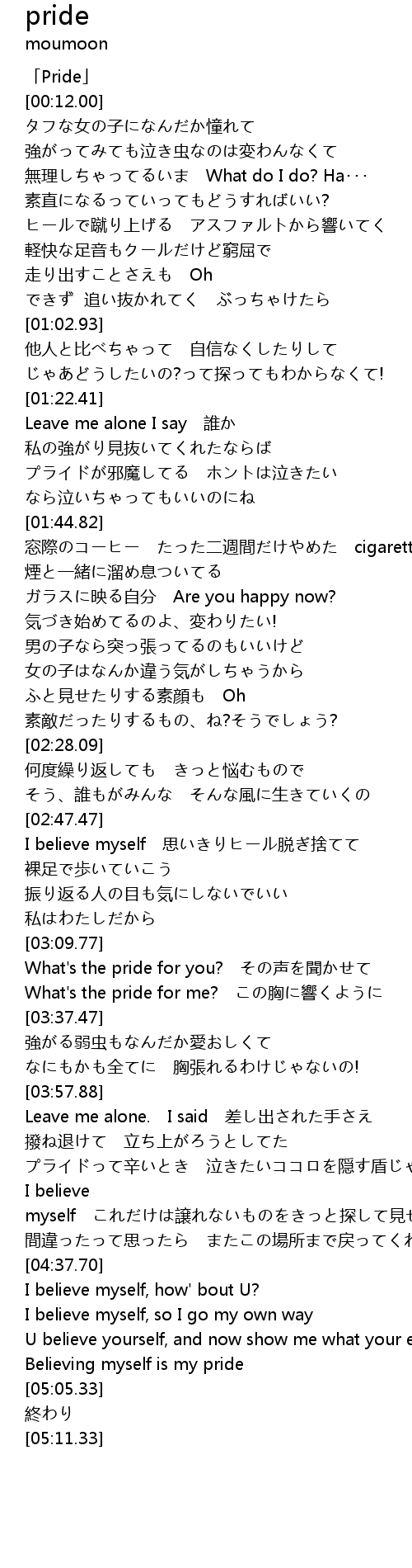 | [04:08.38] | プライドって辛いとき 泣きたいココロを隠す盾じゃないのに |