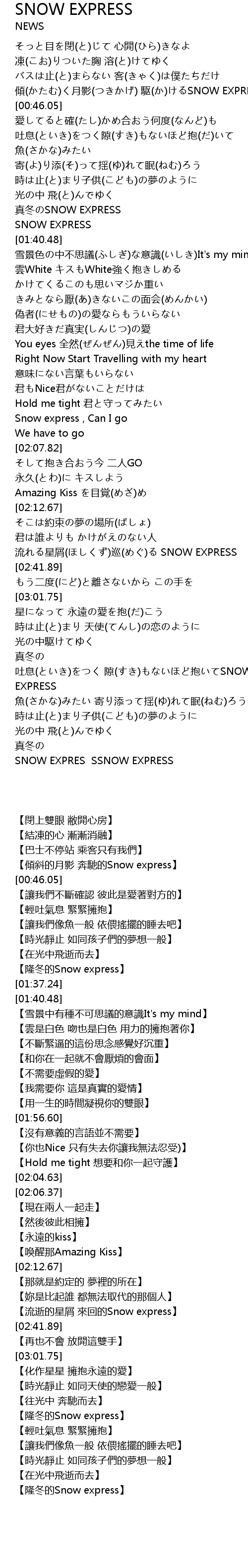 | [03:32.44] | 吐息(といき)をつく 隙(すき)もないほど抱いてSNOW EXPRESS |
