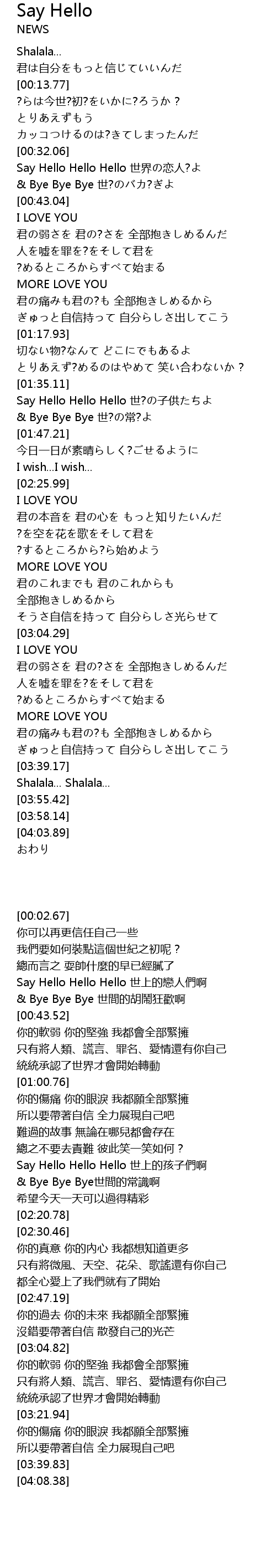 | [00:32.55] | Say Hello Hello Hello shì jiè liàn rén? |