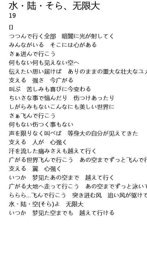 | 广がる大地へ走って行こう あの空までずっと泳いで行こう | |