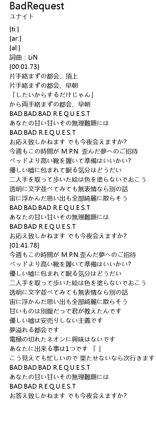 | [01:26.76] | BAD.BAD.BAD R.E.Q.U.E.S.T |