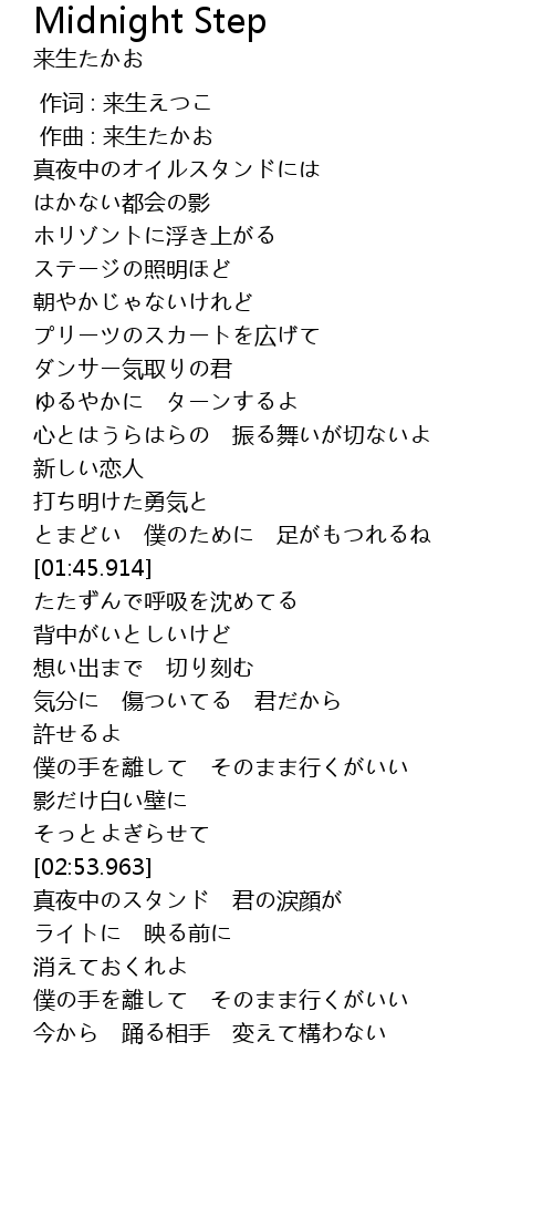 | [03:08.565] | 真夜中のスタンド 君の涙顔が |