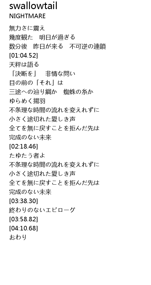 | [00:56.87] | 数分後 昨日が来る 不可逆の連鎖 |